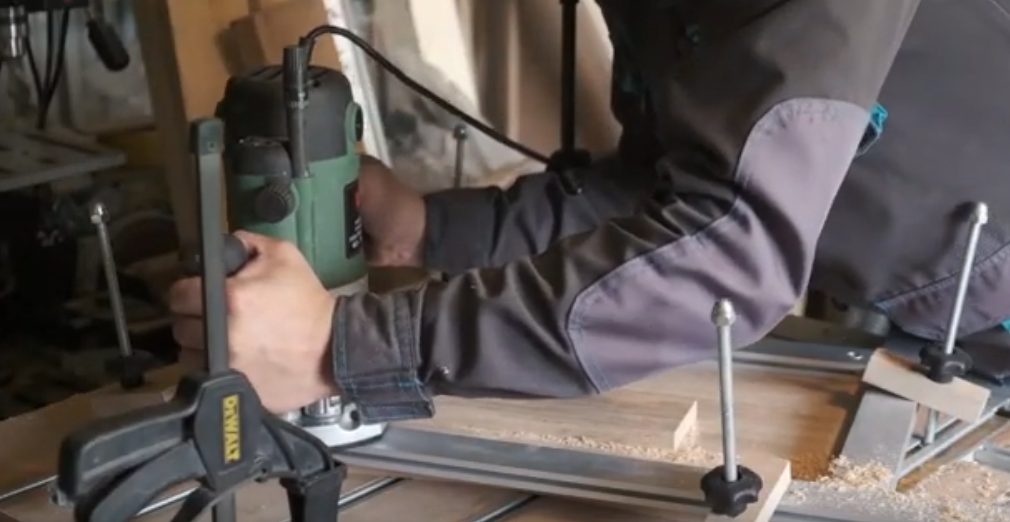 - Выпиливаем столешницу, фрезеруем углубления для формирования бортика. Размечаем отверстия для крепежа и сверлим их: